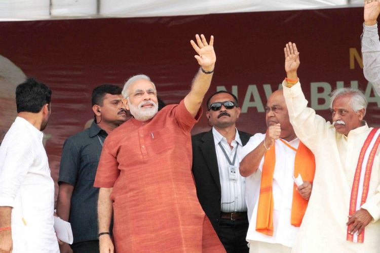 BJP's national election campaign chief Narendra Modi addressing massive public meeting in Hyderabad at Lal Bahadur stadium on Sunday. AP state BJP president Kishan Reddy, former Union Minister Bandru Dattatreya, MP Venkaiah Naidu were present.