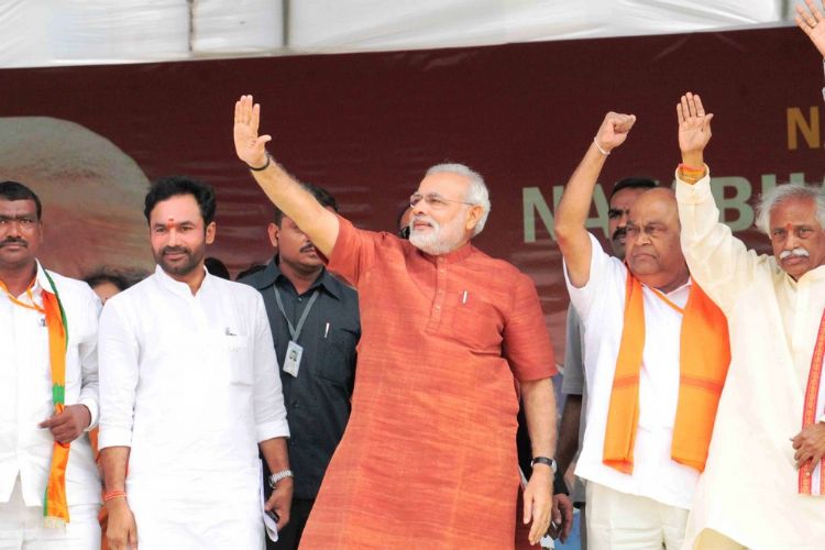 BJP's national election campaign chief Narendra Modi addressing massive public meeting in Hyderabad at Lal Bahadur stadium on Sunday. AP state BJP president Kishan Reddy, former Union Minister Bandru Dattatreya, MP Venkaiah Naidu were present.