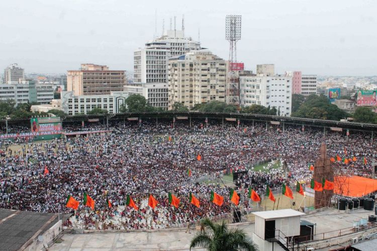 BJP's national election campaign chief Narendra Modi addressing massive public meeting in Hyderabad at Lal Bahadur stadium on Sunday. AP state BJP president Kishan Reddy, former Union Minister Bandru Dattatreya, MP Venkaiah Naidu were present.