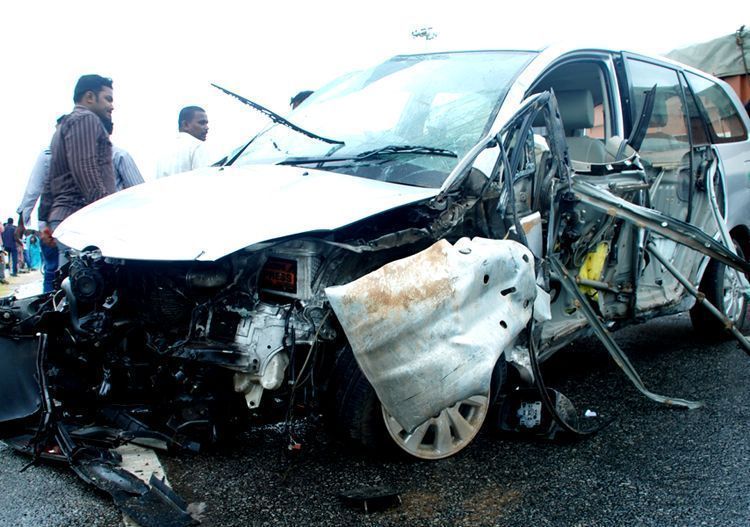 The mangled remains of the four wheeler (Innova) in which Lal Jan Basha was travelling when the mishap occurred during early hours of Thursday. The driver of the ill fated vehicle escaped with injuries.