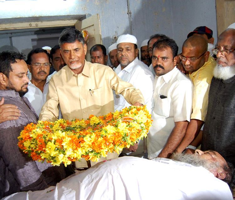 TDP chief Chandrababu Naidu pays homage to the departed leader Lal Jan Basha at NTR Trust Bhavan in Hyderabad on Thursday. Basha died in a road accident near Narketpally in Nalgonda district on Vijayawada – Hyderabad national highway.