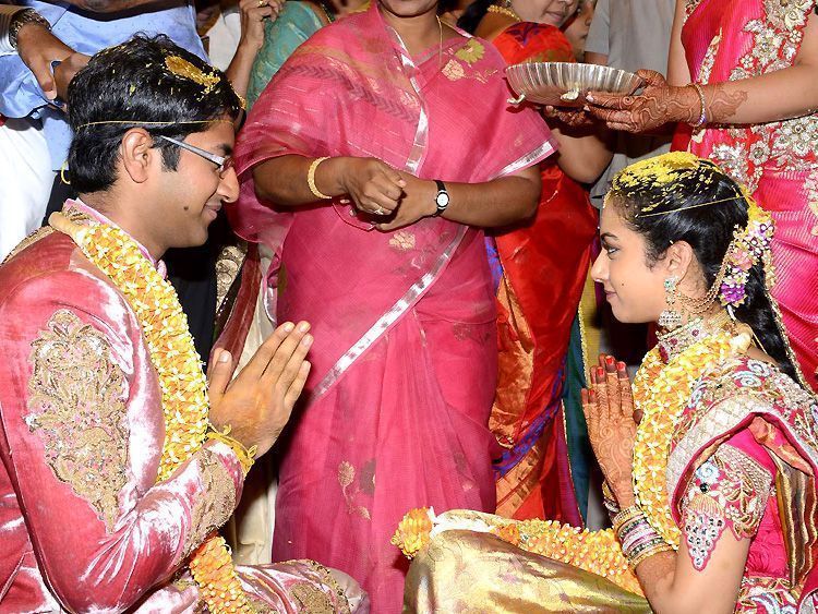 Actor Nandamuri Balakrishna’s younger daughter Tejaswini ties the knot with Sri Bharat at a grand ceremony held in HiTex Convention Center in Hyderabad on Wednesday. Several top political leaders and celebrities of Telugu and Tamil film industry attended the event and blessed the newlywed couple.