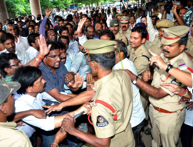 NGOs of Andhra and Telangana almost came to blows at Jala Soudha in Erramanzil on Friday when both groups stages dharna in front of the office. Police had a harrowing time to pacify the warring groups.