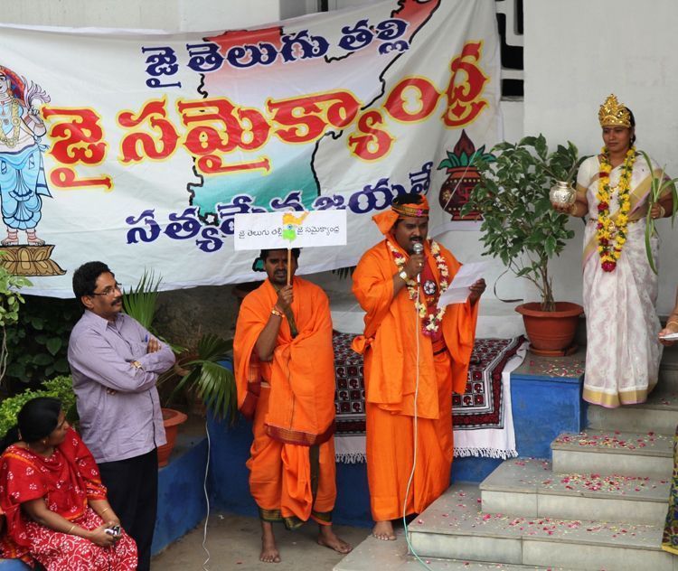 Seemandhra government employees stage a novel protest by wearing saffron robes and a woman employee posing as Telugu Thalli at Vidyut Soudha in Hyderabad on Tuesday. They are on indefinite strike protesting the Congress party's decision to bifurcate the state.