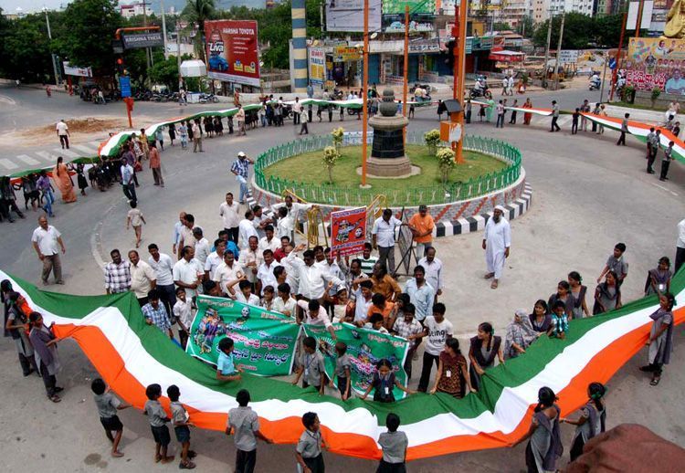Samaikyandhra activists display a huge national flag in Tirupati city on Wednesday. Tirupati observes 48 hour bandh from today in protest against division of the state.