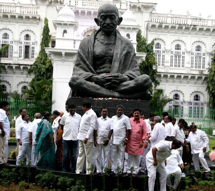 Ministers, MLAs, MLCs and leaders from Seemandhra region gathering at Mahatma Gandhi statue in the Assembly premises before staging a one day fast on Tuesday in protest against Congress party’s decision to divide the state.
