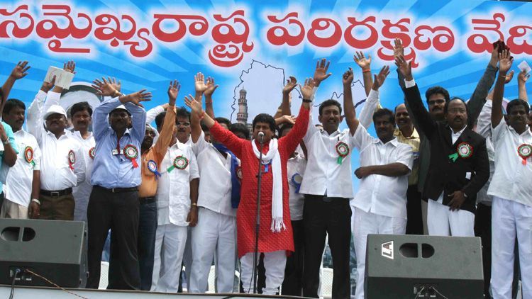 Samaikyandhra Parirakshana Vedika's first ever public meeting in the name of Save Andhra Pradesh held at Hyderabad on Saturday in which APNGOs, leaders and representatives of Teachers’ Associations and RTC Unions participated in large numbers. The atmosphere is vibrant with the slogans of Jai Samaikyandhra.
