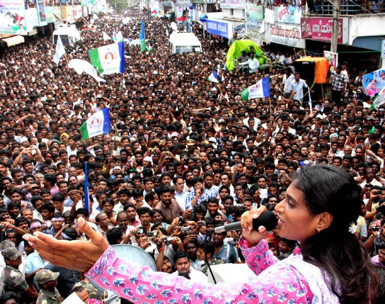 Smt. Sharmila addressing a massive public meeting held in Ravulapalem of East Godavari dist. on Friday as part of her Samaikhya Sankharavam Bus Yatra.