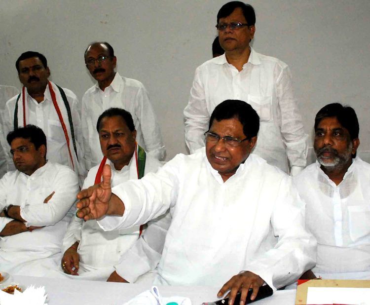 Panchayat Raj minister K Jana Reddy trying to pacify the irate members at a meet attended by Telangana Congress ministers, MPs, MLAs, MLCs in Hyderabad on Sunday.