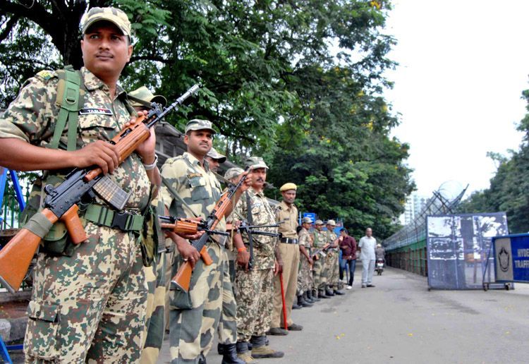 Hyderabad police made heavy security arrangements in view of the Ganesh Nimajjanam on Wednesday. Large number of para - military personnel was posted at sensitive places of the city. Heavy duty cranes were deployed at Hussain Sager for immersion of Ganesh Idols.