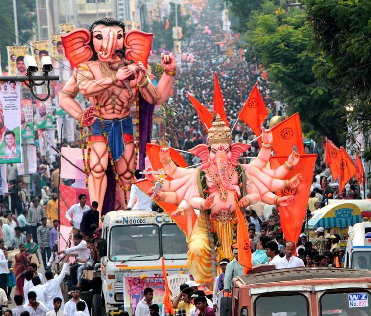 A massive Ganesh idol leading the procession of Ganesh Nimajjanam which began from Charminar to Husain Sager on Wednesday.