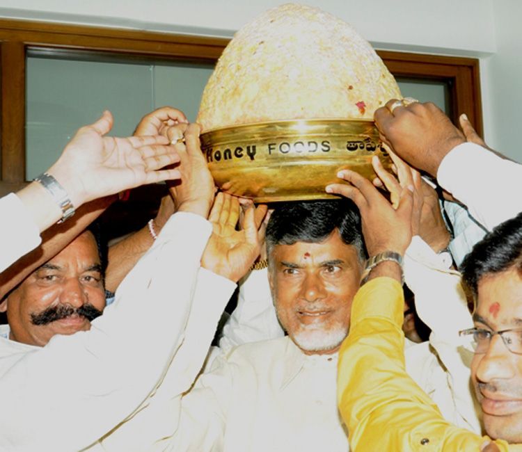 Former Mayor of Hyderabad and TDP leader Teegala Krishna Reddy presenting Balapur Laddu to TDP president N Chandrababu Naidu at NTR Trust Bhavan on Thursday. TKR educational institutions belonging to Krishna Reddy’s son staked claim over the prestigious Balapur Ganesh ‘laddu’ by bidding for it at the highest price yet - Rs 9.26 lakh on Wednesday.