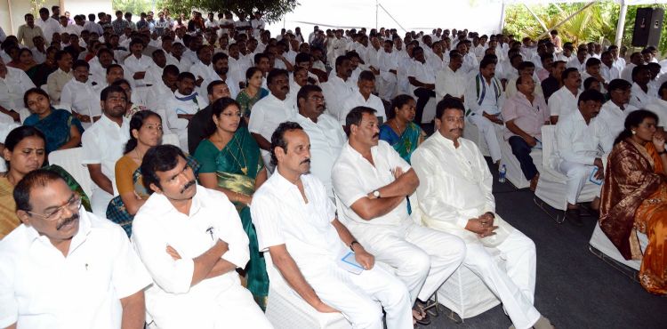 YSRCP hon. president Smt. YS Vijayamma, Smt. Sharmila and party PAC co-ordinator Konatala Ramakrishna and PAC member Bajireddy Govardhan at party's extended meeting held at YSRCP central office in Hyderabad on Saturday