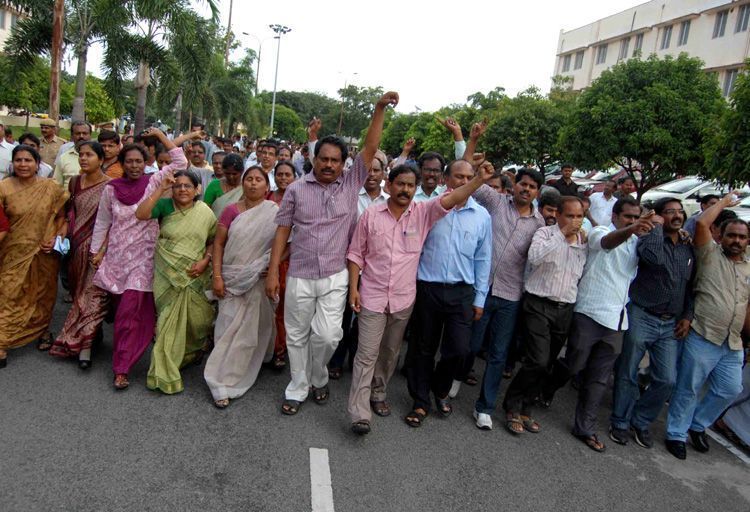 Secreteriate Seemandhra staff who are on indefinite strike staged massive protest in the Secreteriate premises on Friday resenting the Union Cabinet's decision to divide AP. Tension prevailed for a while when police forcibly took the protestors into custody.