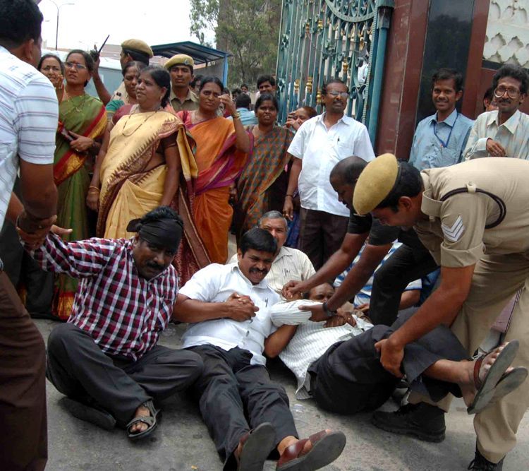 Secreteriate Seemandhra staff who are on indefinite strike staged massive protest in the Secreteriate premises on Friday resenting the Union Cabinet's decision to divide AP. Tension prevailed for a while when police forcibly took the protestors into custody.