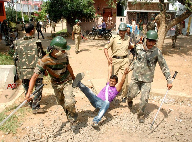 Police and paramilitary force taking away a protestor attempting to block train movement from a track at Vizianagaram on Sunday.
