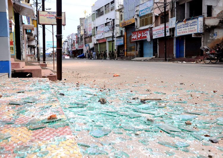 Viziangaram known to be a peace loving town turns into a battle ground with unprecedented protests and vandalism leading to imposition of curfew. Major roads in the town strewn with stones and pieces of glass all over.