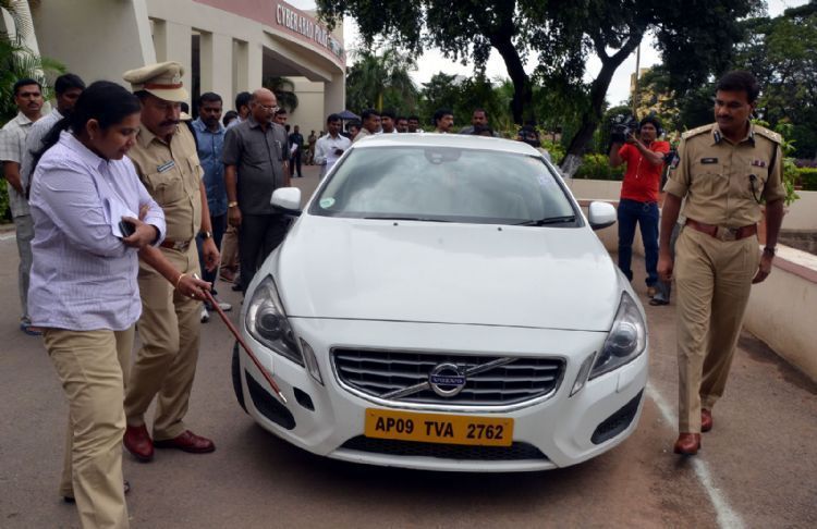 Cyberabad police producing both the accused drivers involed in Techie's abduction and rape on the outskirts of city and the Volvo car used in the crime before media persons on Tuesday.