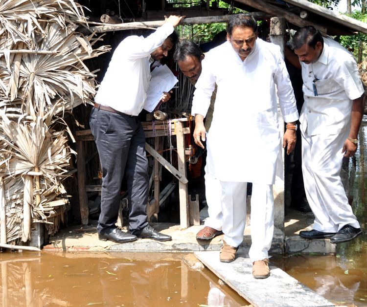 Chief Minister Kiran Kumar Reddy precariously balancing himself while visiting a flood effected village in Prakasam District on Monday.