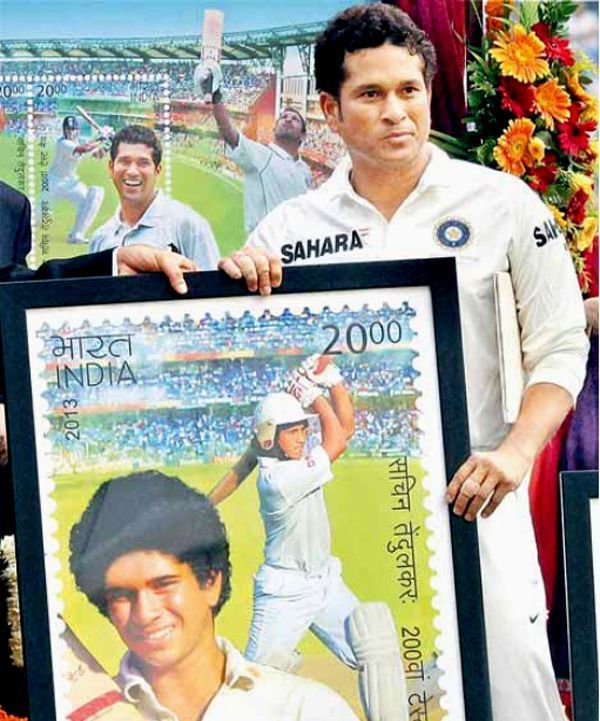 Sachin during the release of his special postal stamp at Wankhede stadium, Mumbai on Thursday.