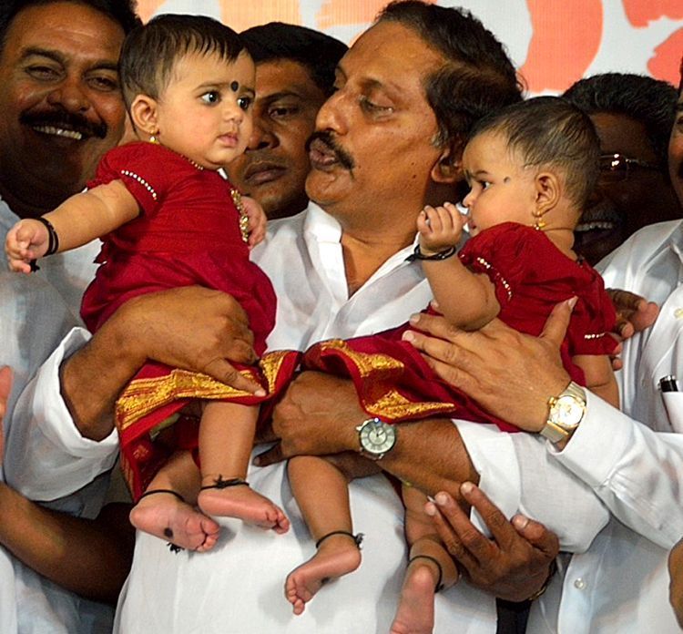Chief Minister N Kiran Kumar Reddy fondly caressing Bangaru Thallulu (baby girls) after handing over certiicates of girl protestion and insurance scheme to mother of babies at a Rachabanda programmed held in Rajhmundry.