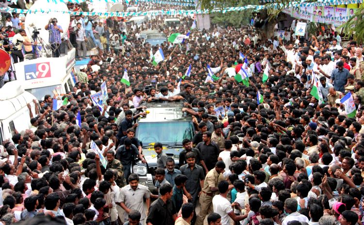 YSR Congress president YS Jaganmohan Reddy addressing a public meeting at Baireddypalem in Chittoor district on Monday, third day of his Smaikya Sankharavam Yatra.