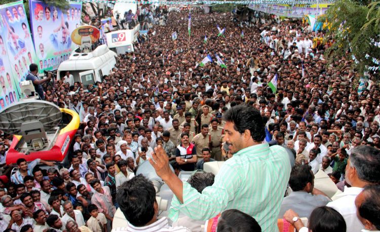 YSR Congress president YS Jaganmohan Reddy addressing a public meeting at Baireddypalem in Chittoor district on Monday, third day of his Smaikya Sankharavam Yatra.