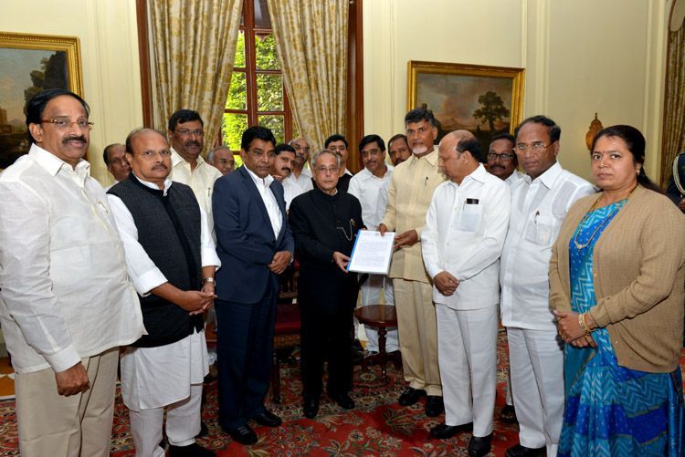 Telugu Desam chief N Chandrababu Naidu along with party leaders meeting President Pranab Mukherjee at Rashtrapati Bhavan on Monday in New Delhi.