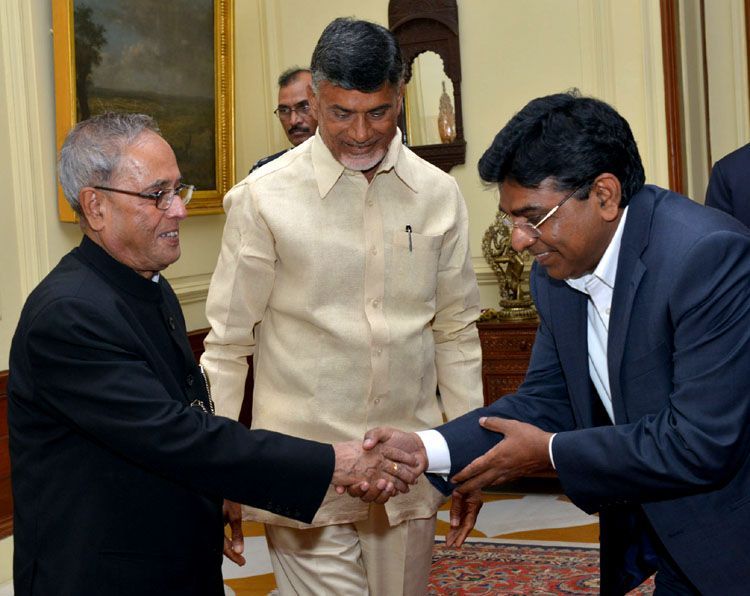 Telugu Desam chief N Chandrababu Naidu along with party leaders meeting President Pranab Mukherjee at Rashtrapati Bhavan on Monday in New Delhi.
