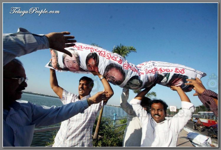 Police foils attempt of Samakiaya Andhra students immersing effigiy of Seemandhra Union Ministers in Hussain Sagar in Hyderabad.