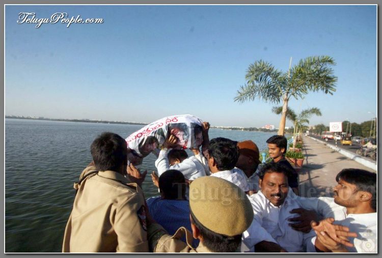 Police foils attempt of Samakiaya Andhra students immersing effigiy of Seemandhra Union Ministers in Hussain Sagar in Hyderabad.