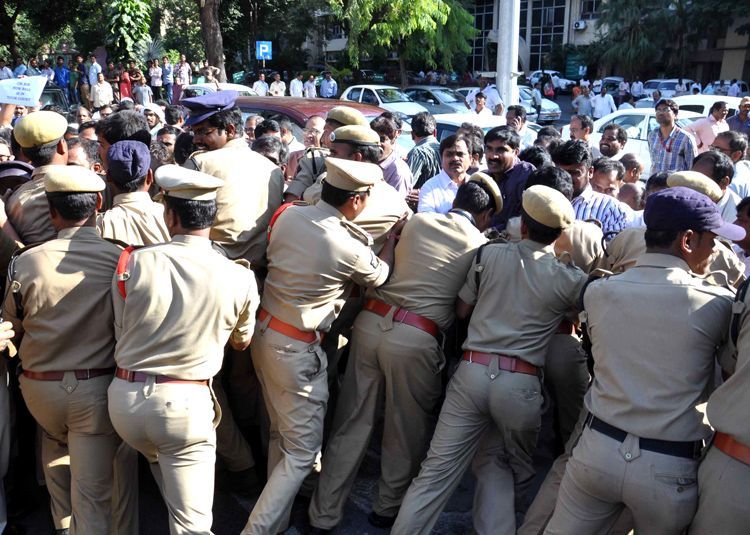 Employees of Telangana and Andhra NGOs after staging dharnas for and against bifurcation of state clashes in Secretariat premises on Friday.
