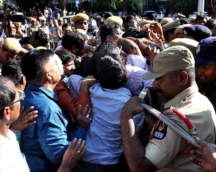 Employees of Telangana and Andhra NGOs after staging dharnas for and against bifurcation of state clashes in Secretariat premises on Friday.