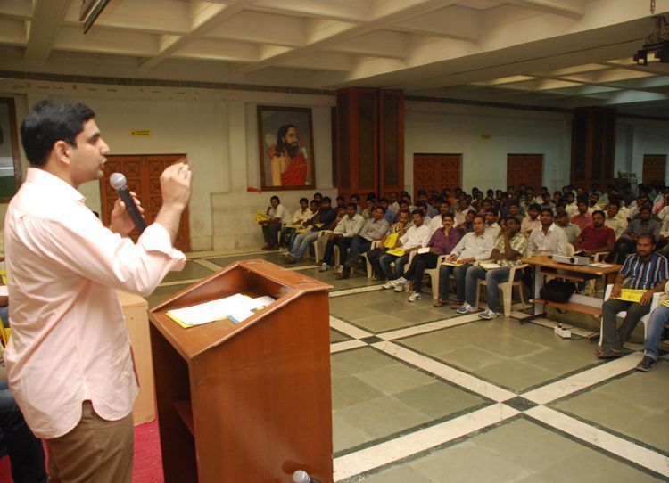 Nara Lokesh son of TDP chief Chandrababu Naidu seen addressing activists of TNSV at a workshop held in NTR Trust Bhavan on Sunday.