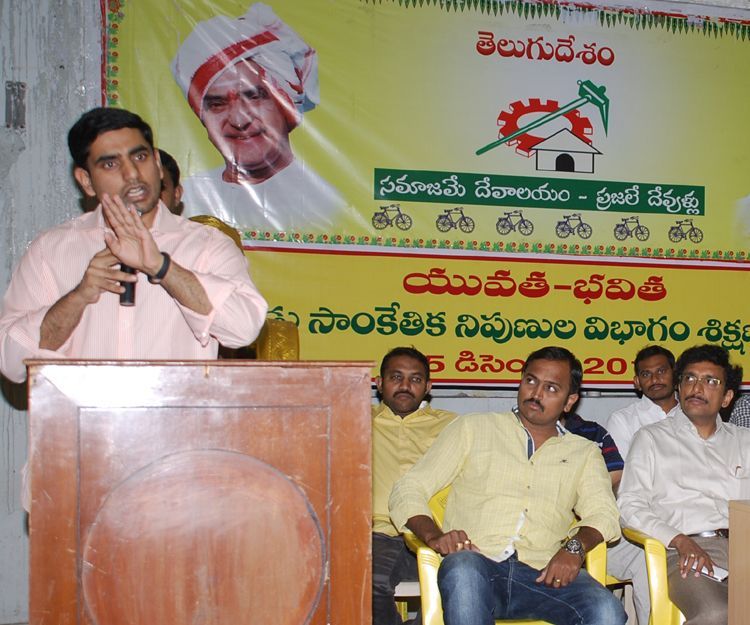 Nara Lokesh son of TDP chief Chandrababu Naidu seen addressing activists of TNSV at a workshop held in NTR Trust Bhavan on Sunday.