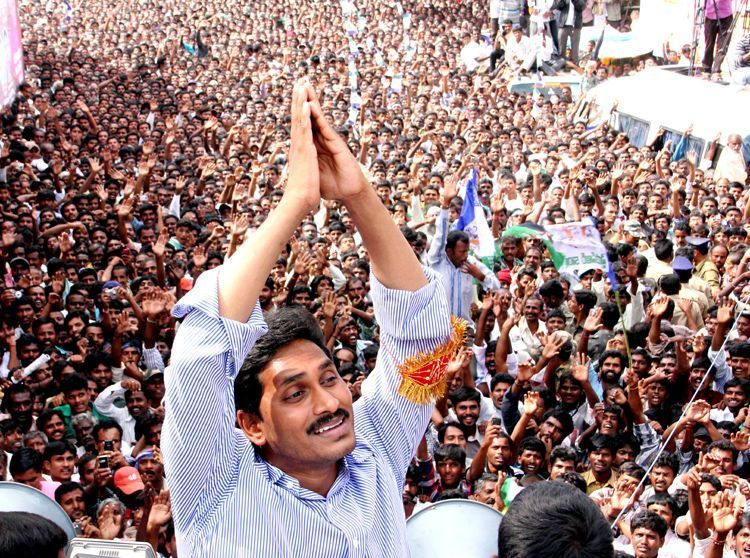 YSR Congress president YS Jaganmohan Reddy greeting people at a public meeting in B.Kothakota of Chittoor dist on Sunday during his Samaikya Sankharavam Yatra.