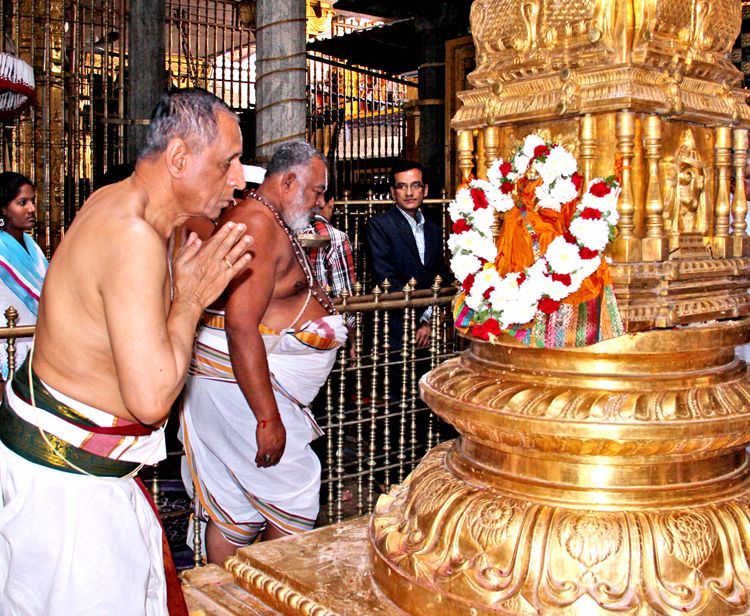 Governor ESL Narasimhan along with his wife Vimala Narasimhan offering prayers at Tirumala on Wednesday.