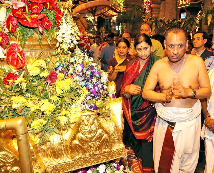 Governor ESL Narasimhan along with his wife Vimala Narasimhan offering prayers at Tirumala on Wednesday.