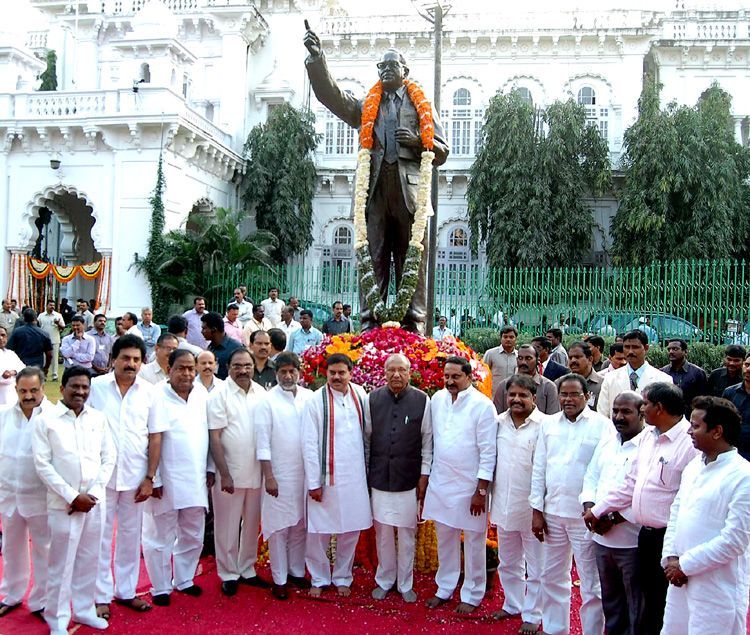 Chief Minister N Kiran Kumar Reddy along with Speaker of Assembly Nadendla Manohar and Council Chairman Chakrapani pose in front of Dr. BR Ambedkar statue in Assembly premises which was unveiled today by Governor ESL Narasimhan.