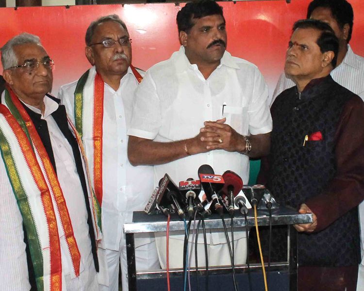PCC chief Botsa Satyanarayana speaking to media along with three Congress official nominees for RS polls before filing nominations on Tuesday