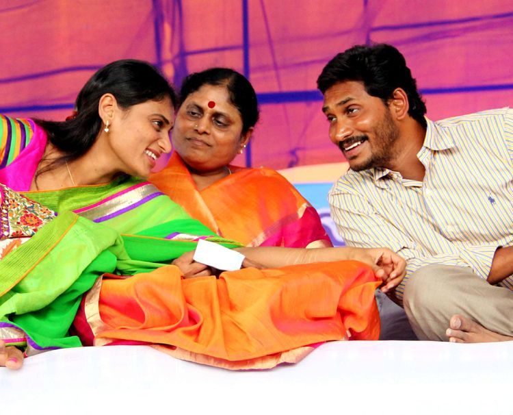 Sharmila is seen indulged in a pep talk with her brother YS Jagan Mohan Reddy at second second plenary of YSRCP held at Idupulapaya in YSR Kadapa dist on Sunday while their mother Vijayamma looks on.