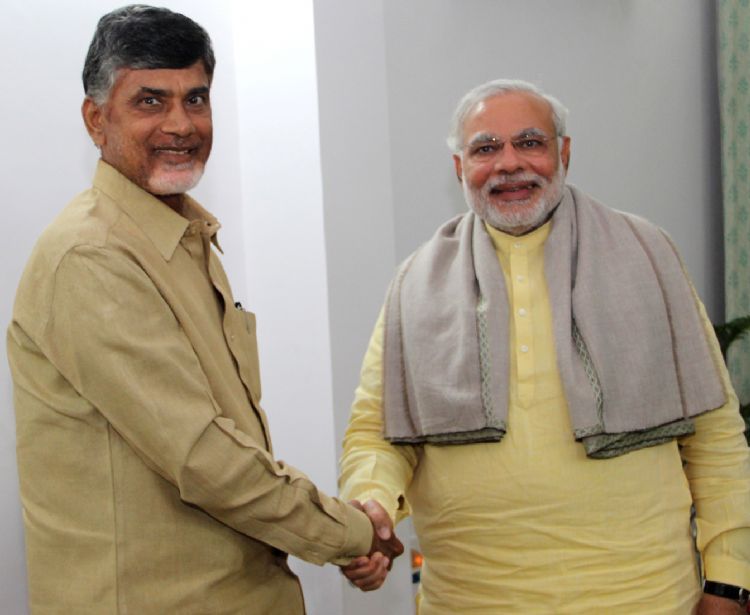 TDP chief N Chandrababu Naidu meeting Gujrat Chief Minister Narendra Modi at Gujrat Bhavan in New Delhi on Tuesday.