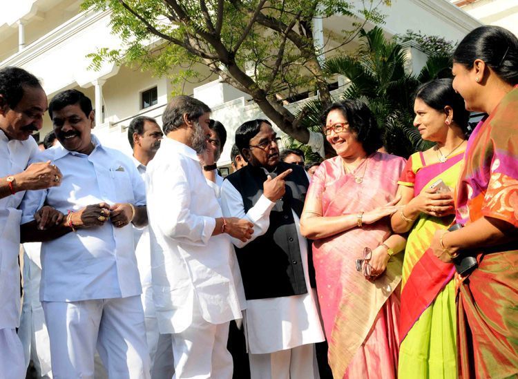 Telangana Ministers who boycotted vote-on-account budget session of Assembly indulged in chit chat before meeting at minister Jana Reddy's residence on Monday.