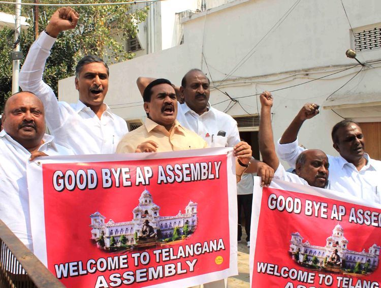 As Telangana Bill was finally introduced in Lok Sabha today, TRS legislators while attending the last day of Vote on Account session of Assembly displayed banners in Assembly premises saying Good bye AP Assembly and Welcome Telangana Assembly.