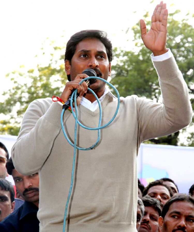 YSRCP president YS Jaganmohan Reddy addresses a massive gathering of party activists who staged a day long protest at Jantar Mantar in New Delhi on Monday opposing central governments move to bifurcate Andhra Pradesh.