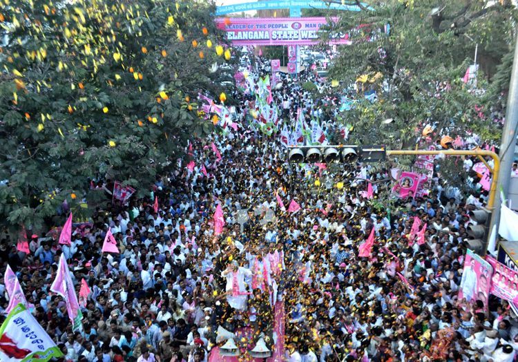 Pink Carpet Welcome: TRS president K Chandrasekhar Rao arrives to a tumultuous welcome accorded by tens of thousands of party activists at Begumpet airport in Hyderabad on Wednesday. Rao later was taken in a rally to Telangana martyr’s memorial at Gun Park near Assembly.