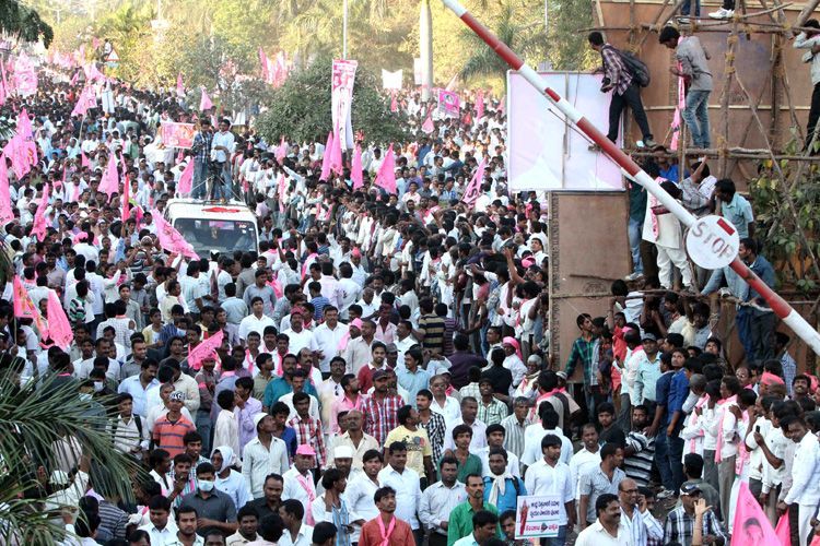 Pink Carpet Welcome: TRS president K Chandrasekhar Rao arrives to a tumultuous welcome accorded by tens of thousands of party activists at Begumpet airport in Hyderabad on Wednesday. Rao later was taken in a rally to Telangana martyr’s memorial at Gun Park near Assembly.