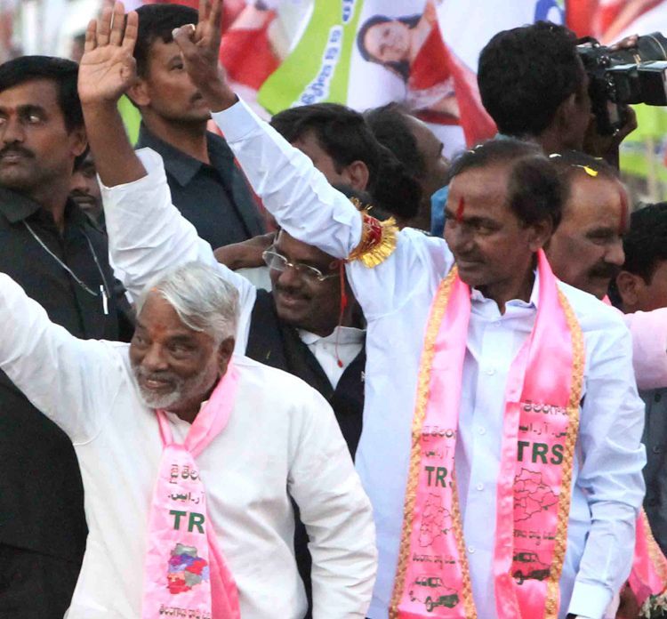 Pink Carpet Welcome: TRS president K Chandrasekhar Rao arrives to a tumultuous welcome accorded by tens of thousands of party activists at Begumpet airport in Hyderabad on Wednesday. Rao later was taken in a rally to Telangana martyr’s memorial at Gun Park near Assembly.