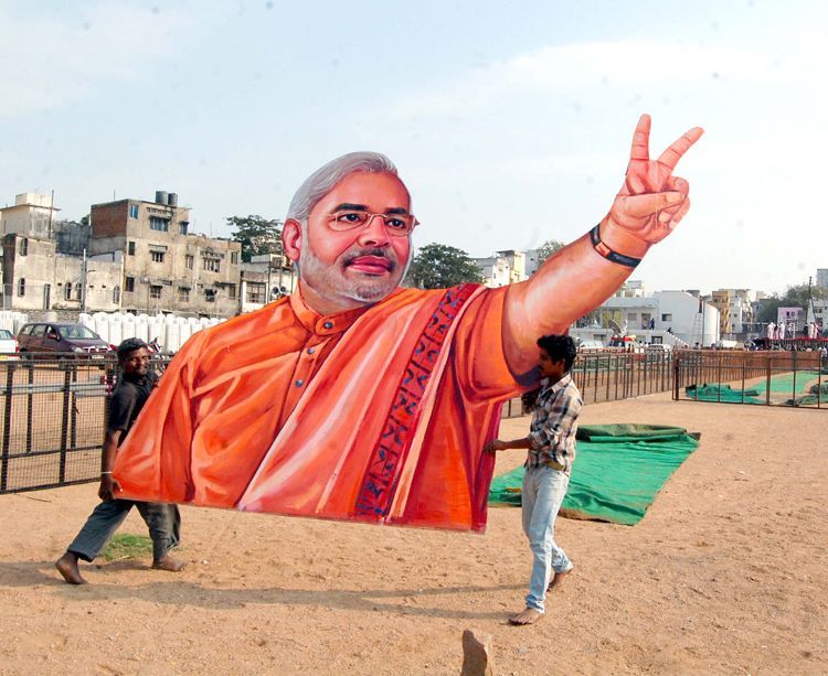 Workers carrying a cutout of BJP’s PM nominee Narendra Modi to erect in the venue for Tuesday’s public meeting of BJP to be held at Nizam College grounds in Hyderabad.