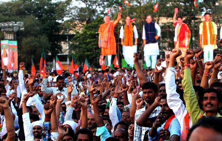 BJP national president Rajnath Singh, party senior leaders Arun Jaitely and Prakash Javdevkar participating in a massive public meeting held at Nizam College grounds in Hyderabad on Tuesday to celebrate the achievement of Telangana state.